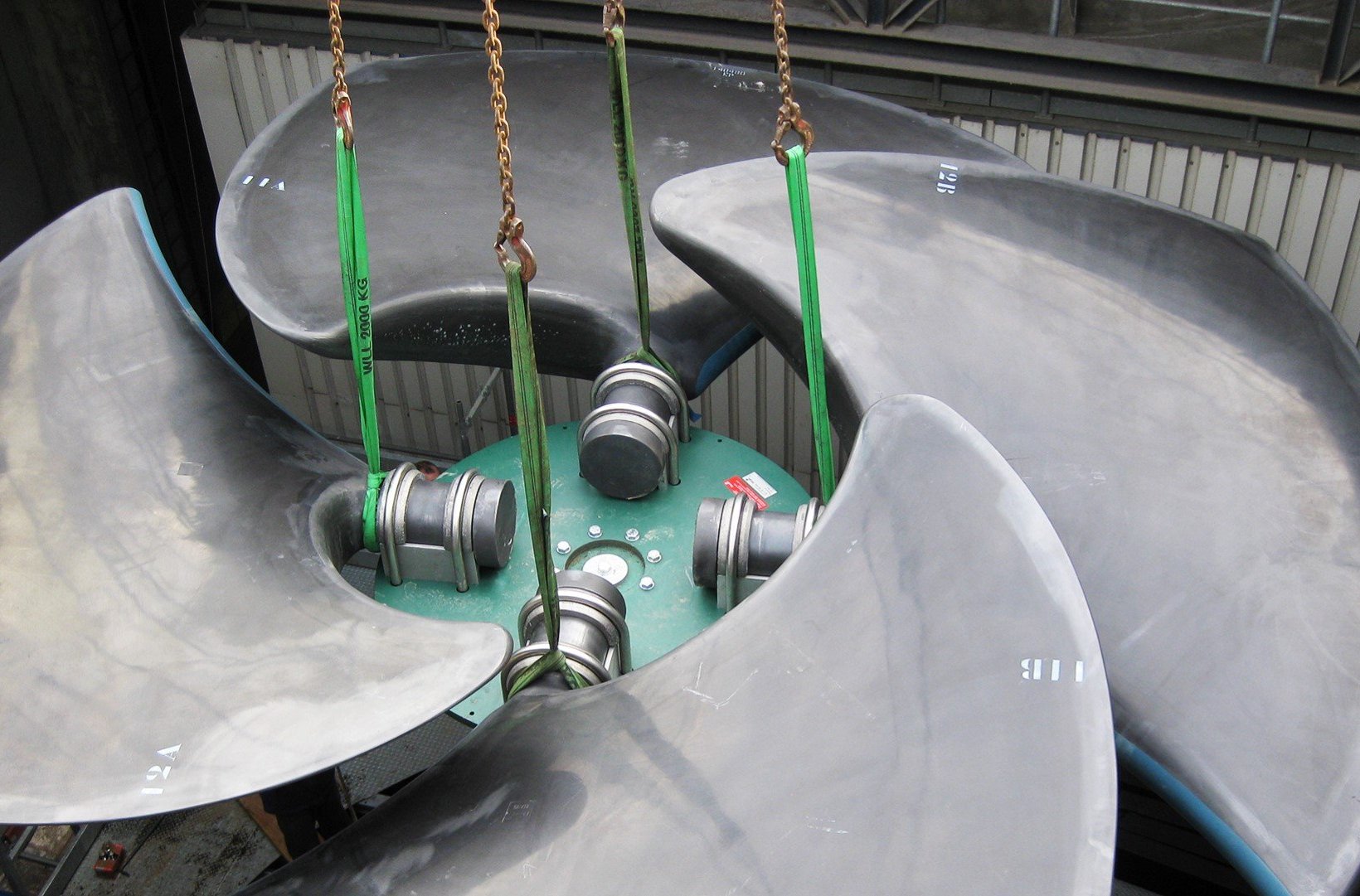 Per Kran wird der Ventilator in Teilen in den Kühlturm eingehoben