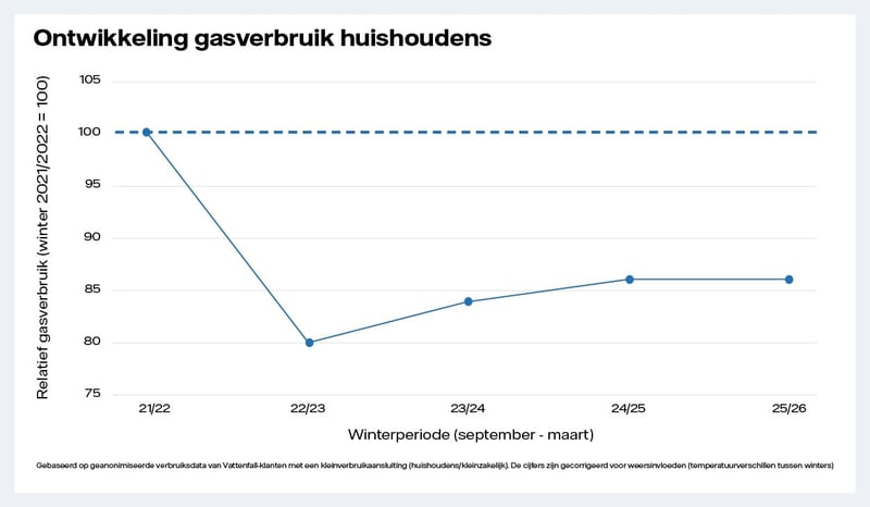 Nederlandse huishoudens gebruiken sinds de energiecrisis van 2022 structureel minder gas. Uit een analyse van het gasverbruik van Vattenfall‑klanten blijkt dat zij deze winter gemiddeld zo'n 14 procent minder gas hebben verbruikt dan in de winter van 2021-2022. Na de sterke daling in 2022 bleef het gasverbruik in de daaropvolgende winters dus duidelijk lager dan vóór de crisis.