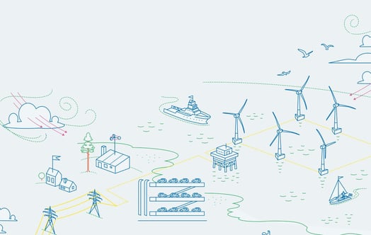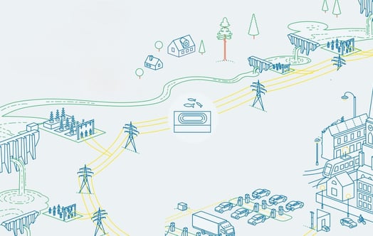 illustration: landskap med kärnkraftverk, byggnader, fordon